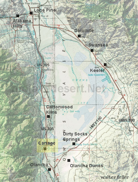 returning with freight.Back in the 1870s, Cartago played an important role in the journey of silver bullion from the Cerro Gordo mines. The bars were ferried across Owens Lake on a steamer named the Bessie Brady to the Cartago landing. From there, Remi Nadeau’s famous 14-mule teams hauled the silver all the way to Los Angeles, then returned loaded with freight. Cartago sits on the west side of Owens Lake, about 3 miles north of Olancha, at 3,629 feet in elevation. Today, it’s known not just for its past, but for its natural beauty. The Cartago Wildlife Area spans 218 acres of freshwater wetlands and springs. It’s a haven for birds like the western snowy plover, white-faced ibis, and rails. In fact, Owens Lake is now recognized as a Nationally Significant Important Bird Area, with 144 bird species recorded here. The land is mostly flat, sitting around 3,600 feet. On the southwest side, you can still see the ruins of an old soda ash plant. Dikes from that time, 3 to 4 feet high, stretch into the dry lake bed. They once surrounded ponds used for soda evaporation. Today, snowy plovers still nest on those old salt flats. Gallery - ![]() - ![]() - ![]() - ![]() - ![]() - ![]() ![]() |