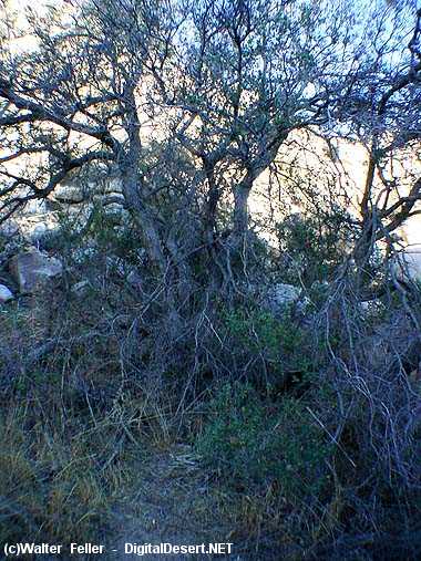 Turbinella Oak - Co-EvolutionThe Turbinella oak, (Quecus dumosa turbinella), has adapted to living in the Mojave Desert, usually above 4,000 feet where more moisture is available.Early desert people harvested the acorns, grinding them into a coarse flour, Now ground squirrels get first crack, carrying them off for winter meals. You may see round, pink swellings, called galls, on the branches. A small wasp is responsible. The female wasp lays her eggs on a tree branch. When the eggs hatch, the larvae that emerge secrete a chemical, causing the tree to grow in a facinating, unnatural way. The caterpillar-like larvae feed inside the gall until mature. Then they chew tiny holes to the outside, flying away to repeat the cycle. Oak galls are not harmful to the trees. < Previous - Next > ![]() Turbinella oak (Quecus dumosa turbinella) |