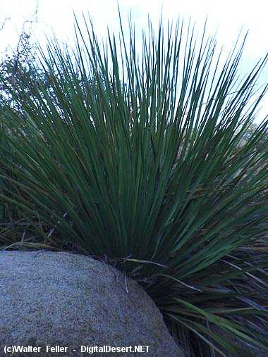 Parry's Nolina - Desert FoodsWhile at first glance it looks like a short Joshua tree, this nolina, nolina parryi, another form of yucca, usually grows only a few feet tall. It has long, grass-like leaves and, in the late spring, if there has been enough rain, will shoot up a five- or six-foot tall, white flower stalk.The stalks provided abundant and dependable food for Cahuilla Indians. They were baked in stone-lined pits, converting the fibrous material into a rich, molasses-like consistancy. < Previous - Next > ![]() Parry's Nolina (nolina parryii) |