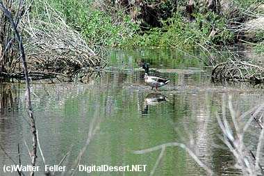 Water Birds in the DesertThe presence of water at Barker Dam draws many animals and birds, even American coots, Western grebes, migrating ducks, and an occasional shorebird.Coots and grebes have been known to nest here, feeding on algae and aquatic inserts. An occasional long-legged wading bird such as a green-backed heron, black-crowned night heron, or the great blue heron, has been seen along the shore, usually just stopping over at a scarce desert water source during migration. < Previous - Next > ![]() Migrating duck in Barker Dam reservoir |