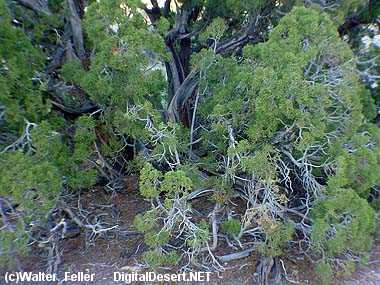 California JuniperIn the Mojave Desert, juniper trees (juniperus californica), are generally found at elevations above 4,000 feet, on the bases and slopes of the mountains. This one has taken hold in the rocky soil around Barker Dam. Soil depth and amount of moisture determine the size and success.Female trees bear silver-blue berries, modified cones which ripen in late summer. The bitter-tasting berries were eaten, either raw or roasted, by traveling Native Americans. Coyotes and small animals appear to enjoy the berries for their moisture. < Previous - Next > ![]() California juniper (juniperus californica) |