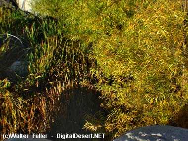 Welcome GreeneryBelow the dam is more moisture. Plants not always associated with drier regions, such as these large willows, are provided the opportunity to succeed. The trees were probably planted by early ranchers, perhaps for the purpose of shading their cattle and water troughs.When water is high behind the dam, increased amounts of seepage allow cattails to thrive. Other plants, like saltbush, sprout along the wash edge, where runoff and evaporation produce a more alkaline soil. In wet years red-spotted toads, their tadpoles, and many insects take advantage of puddles below the dam. < Previous - Next > ![]() Willow and cattails behind dam |