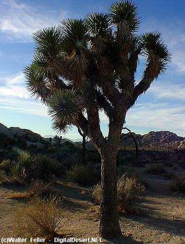 Joshua Tree - Tree of LifeThe Joshua tree, (yucca brevifolia), grows wild primarily in the Mojave Desert. It has adapted to reduced rainfall by spreading its roots in a dense, shallow network to collect as much surface moisture as possible.Almost every part of this plant has been or is used by other desert dwellers, people as well as the animals. Chemehuevi indians wove its fibers to make baskets, sandals, and mats. Scott's orioles can sometimes be seen near woven nests hanging beneath tree limbs. Watch for ladder-backed woodpeckers or flickers flying in and out of holes they drill in the tree trunks. Rock squirrels, birds, and mule deer eat the creamy white blossoms. Later fruits and seeds provide food for antelope ground squirrels and other small animals. Even after death, a tree trunk on the ground provides a home for desert night lizards, ants, and scorpions. Eventually, termites return it to the desert enriching the sandy soil for the next Joshua tree sprout. < Previous - Next > ![]() Joshua tree - Tree of life |