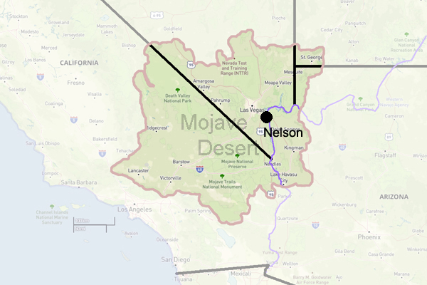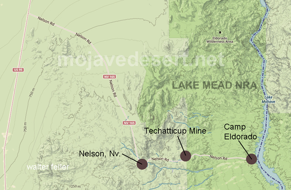 Nelson is part of Clark County, Nevada. Nelson is located west of the Colorado River in El Dorado Canyon, Eldorado Mountains. About 8 miles (13 km) southeast of its junction with U.S. Highway 95. Route 165 continues east for 5 miles (8 km) to Nelsons Landing on the Colorado River, 18 miles (29 km) by water north of Cottonwood Cove on Lake Mojave. By road, Nelson is about 25 miles (40 km) from Boulder City. ![]() Pilot Mountain, Eldorado Canyon When Spanish explorers found gold in 1775, they named the canyon Eldorado. One of the biggest mining booms in state history occurred in the town, which was the site of one of Nevada's first major gold strikes. Around 1859, gold and silver were discovered here, and in 1861, a rush began to the canyon. There were several mining camps established in the canyon, and a steamboat landing called Colorado City was established at the Colorado River. ![]() Techatticup Tunnel This area was known for its rough and lawless reputation during its heyday. It was an isolated location where deserters from both Union and Confederate armies hoped that military authorities would not look for them during the American Civil War. In the middle of the canyon was the notorious Techatticup Mine. Disputes over management, ownership, and labor led to routine and ordinary killings. The mine produced several million dollars in gold, silver, copper, and lead despite its sinister reputation. From 1858 until 1945, mining was active in the canyon. Nelson was named after Charles Nelson, a camp leader killed in 1897 by the renegade Indian, Avote, along with four other people. Between 1901 and 1905, the San Pedro, Los Angeles, and Salt Lake Railroad was constructed across southern Nevada, through Las Vegas, to Daggett, California, where it connected to the AT&SF, and the Salt Lake–Los Angeles line was completed by May 1, 1905. The railway ended steamboats at Eldorado Canyon, so the landing and mill were abandoned. A road to the railroad was built near the head of the canyon that became Nelson. Nelson became the new post office in August 1907 when Eldorado's was closed. Nelson's Landing![]() Nelson's Landing - circa 1950s A village and landing were established on the Colorado River at Lake Mohave at Nelson's Landing, about 5 miles (8 km) east of Nelson. This is where the canyon meets the lake. During a flash flood in 1974, Nelson's Landing's wharf was destroyed. An intense downpour in the regional mountains caused a flash flood that washed Nelson's Landing into Lake Mohave. From the local mountains, five channels flow into the river. Nelson's Landing was at the intersection of these channels. The entire landing and village were destroyed when the flood came, and nine people died. As the wall of water and debris reached the river, it was 40 feet (12 m) high. Today![]() Through Nelson, you can access the mines and the landing. A large portion of Nelson, which was not affected by the 1974 flood, still exists today and is located near the top of the wash, away from the flood channels. The sparsely populated community consists mainly of privately owned ranch houses, as well as a river and mining tour business housed in a former Texaco gas station north of the road from the Techatticup Mine, which has served as a filming location for several feature films. It is a warning to visitors to this region to watch out for conditions that can cause flash flooding, like Nelson's Landing. Open mines and ventilation shafts should also be avoided. |