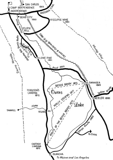 Owens Lake - pre 1913Nonetheless, the Bessie Brady was a unique pioneer, the first of a handful of curious craft which in the years to follow were destined to chum a foamy wake on all of the desert lakes of eastern California and western Nevada - from Owens. Mono and Walker Lakes on the south to Klamath, Pyramid and Honey Lakes on the north. The idea of putting a steamer on Owens Lake was first conceived by James Brady, superintendent of the Owens Lake Silver-Lead Company's smelting furnaces at Swansea on the eastern shore of the lake. Brady was a newcomer to the valley and he had quickly earned a reputation among the old timers as being somewhat of a dandy. His first official act as superintendent was to hire a coachman with a carriage-and-four for the sole purpose of driving him about the countryside. So afterward he built a large and commodious adobe house for himself near the lake shore - complete in every detail including a cool "wine room" stocked with hogsheads of Basses" ale and bitter beer. Such elegance, mostly at company expense, rankled many of the practical miners and when he decided to build a $10,000 steamboat, supported by company funds, there was strong speculation that it was solely intended to be Brady's private yacht. Nonetheless, the introduction of a steamer was to prove a sound financial investment for several years, although Brady sold out before he had a full opportunity to enjoy its success. The keel of the Bessie Brady was apparently laid in late February or early March by William Tiernan on the bank of the Owens River, a few miles above the lake. The hull was finally completed in late May, after many trying delays, the greater part of which resulted from the terrible havoc wrought by the great Owens Valley earthquake on March 26. The craft was then floated down to the lake and moored at the new wharf at Swansea. There the boiler and engines were mounted and on June 27 the Bessie Brady made her maiden voyage across the lake. On this trip she carried 700 bars or about thirty ton of silver bullion from the Swansea furnaces to the waiting wagon teams at the foot of the lake. The following week she was christened and served as the center of attraction at the Fourth of July celebration. She still lacked deck houses and other minor work, however, and it was not until the end of July that she was completely fitted and ready for service. While the hull was being built on the river, the Owens Lake SilverLead Company started its wharf at Swansea and land speculation began at the other would-be lake ports. D.H. Ferguson, the co-projector of the steamer, staked out a plot of land at the northwest comer of the take where he planned to build a wharf to carry all of the trans-shipping north into Owens Valley. Even before the wharf was built he christened the site Ferguson's Landing. John Baptise Daneri, a native of Sardinia and a successful merchant at Lone Pine, was the first outsider to take advantage of the new project. In June he commenced building a large warehouse and store at the southwest shore of the lake at the head of the road to Los Angeles. Before the end of the month the first bullion was unloaded at his landing and it was soon conceded that this was to be the major port on the lake - controlling as it did all bullion shipments out of the valley to the south and nearly all in-bound freight shipments. Despite its increasing importance this port was without a name for nearly six months, during which time Pleasant Chalfant referred to it variously as "that embryotic town at the foot of Big Lake," "Lakeville" and "Danerisburg. Finally on the first of November, Daneri wistfully hoping that his new warehouse and its neighboring shanties might someday become the mighty Carthage of Owens Lake, christened the dusty ensemble Cartago, and the nameless town was named. The only other landing was at the mouth of Cottonwood Creek on the west side of the lake. On the upper reaches of this stream Col. Sherman Vanderventer Stevens had his sawmill and from the landing at Cottonwood he proposed to ship lumber and charcoal to the mines and furnaces of Cerro Gordo and Swansea. Ultimately as new mines were developed east of the lake, Stevens built his own steamer to handle the lumber business. By early August of 1872 the wharf was completed at Cartago and the Bessie Brady was plying the lake with regular shipments of bullion from Swansea. The bullion teams which once plodded through the deep sand around the lake had been discontinued and the new steamer was quickly "corralling' all of the freighting both north and South. But in early October, while the enterprise was still getting started, James Brady turned his attention to the newly discovered mines at Waucoba east of the Inyos, and sold out his interest in the steamer to John Daneri. Ferguson and Daneri incorporated as the Owens Lake Steam Navigation Company, and retained William R. Low, a Maryland gunwright as captain. The company was well supplied with business - the Bessie Brady whisking away the bullion ingots from the dock at Swansea as fast as the combined furnaces of Swansea and Cerro Gordo could produce them. But here the irony lay, for the steamer was too efficient at shipping the bullion across the lake and the teamsters hauling it south over muddy winter roads could not begin to keep up. As a result the silver bullion began to pile up on the wharf at Cartago. By the first of January, 1873, a crisis was reached when 181,000 bars of bullion were being held up awaiting shipment south. Of these 12,000 bars were stacked on the wharf and in the street at Cartago. Since this bullion represented a total of $600,000 lying idle, the mining companies were forced to cut back their production until the bullion could be hauled away to be sold. By March 15, however, the situation had not improved, and there were still 17,000 bars awaiting shipment - nearly all at Cartago where some had been stacked to make shelters by unemployed miners