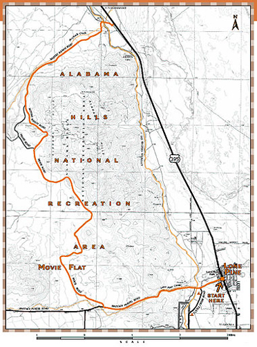 Eastern Sierra & Death Valley SUV Route Guide Route 2 Alabama HillsBizarrely-shaped boulders and pinnacles of stone; behind them the snow-capped peaks of the High Sierra - No wonder the Alabama Hills have been the setting for hundreds of films - depicting deserts of the old west, the far east, and even distant galaxies!What to expect: Although it begins on pavement, most of this route is on a well-maintained graded dirt road that is usually accessible year-round. Length: 12.1 miles. Driving time: about 1 hour, one way.