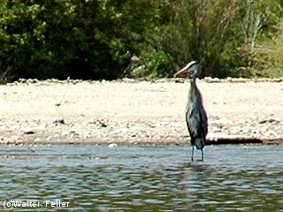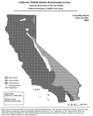 Ardea herodiasThe Great Blue stands 132 cm (four feet) tall, has a 213 cm (seven-foot) wingspan and weighs 2.5 kg. It has a long yellow bill. Adults have blue-grey wings and back and a white head with a black cap and a long black plume. In flight, the long neck is held in an S-shape with the long legs trailing behind. This bird flies with strong deliberate wing beats. Family: ARDEIDAE Ardea herodias Order: PELECANIFORMES Class: AVES Written by: S. Granholm Reviewed by: D. Raveling, D. Airola Edited by: R. Duke DISTRIBUTION, ABUNDANCE, AND SEASONALITY![]() The great blue heron is fairly common all year throughout most of California, in shallow estuaries and fresh and saline emergent wetlands. Less common along riverine and rocky marine shores, in croplands, pastures, and in mountains above foothills. Common July to October in salt ponds where fish are numerous (Cogswell 1977). Locally common near rookeries February to June or July. Few rookeries are found in southern California, but many are scattered throughout northern California; knowledge of their locations is incomplete (Mallette 1972, Belluomini 1978, Garrett and Dunn 1981). SPECIFIC HABITAT REQUIREMENTSFeeding: Nearly 75% of the diet is fish, mostly species not sought by humans (Cogswell 1977); also eats small rodents, amphibians, snakes, lizards, insects, crustaceans, and occasionally small birds. Stands motionless, or walks slowly, when searching for prey in shallow water (less than 30 cm; 12 in) or, less commonly, in open fields. In a pond in Florida, fed mostly in open water rather than among emergent vegetation (Kushlan 1976b). Grasps prey in bill, rarely impaling. Parents regurgitate food for nestlings.Cover: Perches and roosts in secluded tall trees. Also perches on kelp beds offshore. Reproduction: Usually nests in colonies in tops of secluded large snags or live trees, usually among the tallest available; rarely nests on ground, rock ledges, sea cliffs, mats of tules, or shrubs. Colonies should be protected from human disturbances, which often cause nest desertion (Ives 1972, Gould 1974, Jackman and Scott 1975). Water: No additional information found. Pattern: For nesting, prefers secluded groves of tall trees near shallow-water feeding areas, but feeding area may be up to 16 km (10 mi) distant (Krebs 1974). SPECIES LIFE HISTORYActivity Patterns: Active yearlong, feeding both night and day, but most active around dawn and dusk (Terres 1980).Seasonal Movements/Migration: In June or July, after breeding, disperses from nesting colonies to outlying areas, but there is little regular migration (Gill and Mewaldt 1979); many depart from northeastern California and east of the Sierra Nevada in winter. Home Range: In British Columbia, breeders flew up to 16 km (10 mi) from nest (Krebs 1974). Territory: Breeding territory includes only the nest and immediate surroundings (Cottrille and Cottrille 1958, Mock 1976). Nests in Marin Co. were spread as far apart as sitting birds could reach (Pratt 1970). Feeding territories may be defended (Palmer 1962, Krebs 1974, Kushlan 1976b), particularly in the nonbreeding season. Reproduction: Usually arrives on breeding grounds in February. Courtship and nest-building begin shortly thereafter, and eggs are laid in late February or March. Monogamous, and usually nests in colonies, sometimes with 5 or more pairs, but often fewer; and occasionally nests solitarily. Clutch size 1-8, but usually 3-4. Single brooded. Incubation lasts about 28 days. Semi-altricial, downy young are cared for by both parents. Young may fly by 7 wk, but still return to the nest for 2-3 wk, and may be fed by parents until 11 wk old (Pratt 1970). In Marin and Humboldt cos., most fledglings left nests in June and July, but some left as late as September (Pratt 1970, Ives 1972). At high elevations, breeding phenology may be delayed a month, or more. Reportedly breeds first at 2yr. Niche: In California, often nests in mixed colonies with great egrets. Old nests sometimes reused by great horned owls, long-eared owls, and other birds. In a Placer Co. breeding colony, the only avian predator apparently was the goiden eagle; other large raptors and corvids were ignored (Wilburn 1971). Sensitive to human disturbance near nests, and probably to pesticides and herbicides in nesting and foraging areas (Jackman and Scott 1975). Populations in California increased between 1970 and 1978 (Belluomini 1978). Life history accounts for species in the California Wildlife Habitat Relationships (CWHR) System were originally published in: Zeiner, D.C., W.F.Laudenslayer, Jr., K.E. Mayer, and M. White, eds. 1988-1990. California's Wildlife. Vol. I-III. California Depart. of Fish and Game, Sacramento, California. Updates are noted in accounts that have been added or edited since original publication. |