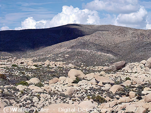 The Contact Zone![]() Look across the valley at the ridge in the distance and you can see another type of rock that is common in Joshua Tree National Park. This rock is known as Pinto Gneiss and it lies on top of the lighter colored White Tank Granite. Look closely and you can see the actual zone where the White Tank Granite meets the Pinto Gneiss. As the process of erosion or wearing continues, rock on top is broken down, exposing the rock underneath. < Previous --- Next > |