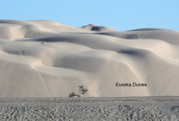 Eureka Sand DunesFN4. Location/Access:(37o 06.741’N, 117o 40.858’W) The Eureka Dunes can be reached by a side road heading south 11 miles from the Big Pine Road. The road in from Big Pine is paved until it reaches the valley floor whereupon it becomes gravel. The main gravel road is usually in excellent shape but the side route down to the dunes often has severe washboards. Best Time: Afternoon, all year. Geology: The Eureka Valley Sand Dunes are the highest in the state at about 676 feet (Berkstresser, 1974). The dunes are either longitudinal or transverse as can be seen from higher vantage points such as near Site FN3. They have characteristics of both types. The sand is mostly derived from local washes such as those draining down from the granitic rocks to the west. The northerly winds then blow the sand south towards the dunes. As the wind rises over the mountains, it lifts off the ground and looses its saltating ability and the sand is dropped and dunes form. These dunes are also “booming sands”. That is, under proper circumstances, they make noise. Although the Kelso Dunes south of Death Valley and Sand Mountain near Fallon, Nevada produce better noise, one can get the dunes to make the vibrating booming noise here at Eureka Dunes by climbing the highest dune and then jumping down the northwest face and causing a sand cascade. Booming sands are produced when the sand grains are all about the same size (about .7mm), polished and pitted and made of quartz. The resulting vibration of one grain against another produces the sound. On these dunes, since the sound is not too obvious, it will help if there is no wind and you listen closely as you start a cascade near the top. ![]() |