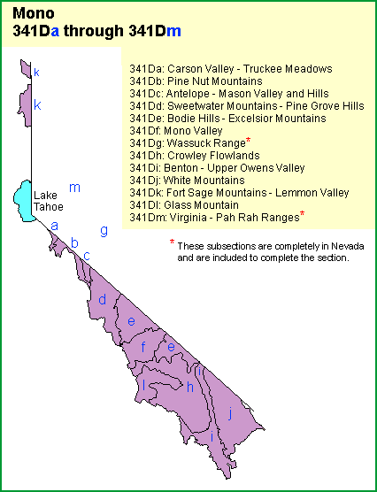 The Mono section is divided into 13 subsections A- Carson Valley - Truckee Meadows ... consists mostly of an alluvial plain in Truckee Meadows and the Spanish Springs, Washoe, Carson, and ... B- Pine Nut Mountains ... comprises the Pine Nut Mountains. It has a temperate to cold, semi-arid climate. C- Antelope - Mason Valley and Hills ... includes Mason and Smith Valleys between the Pine Nut Mountains on the west and the Wassuck Range on the east, ... D- Sweetwater Mountains - Pine Grove Hills ... includes the Sweetwater Mountains, which are between the West Walker and East Walker Rivers; the Wellington and ... E- Bodie Hills Excelsior Mountains ... includes the Excelsior Mountains; the Bodie, Anchorite, and Adobe Hills; and the Alkali and Huntoon Valleys. F- Mono Valley ... consists of the lake plain around Mono Lake, which is at the base of the steep eastern slope of the Sierra Nevada. G- Wasuck Mountains* ... comprises the Wassuck Range, which is just west of Walker Lake. H- Crowley Flowlands ... includes the Benton Range, Blind Spring Hill, Granite Mountain, Mono Craters, Volcanic Tableland south of the Benton Range,.. I- Benton - Upper Owens Valley ... includes the Queen, Benton, Hammil, Chalfant, and upper part of the ... J- White Mountains ... comprises the White Mountains, the highest mountain range in the Great Basin. It has ... K- Fort Sage Mountains - Lemmon Valley ... includes mountains, hills, and valleys between the Sierra Nevada on the west and the Pah Rah Range and Pyramid Lake on the east. L- Glass Mountain encompasses volcanic peaks and craters on a volcanic plain northeast of the Sierra Nevada below Mammoth Pass, ... M- Virginia - Pah Rah Ranges* ... comprises the Virginia Range south of the Truckee River and the Pah Rah Range north of the Truckee River. *Subsections completely in Nevada |