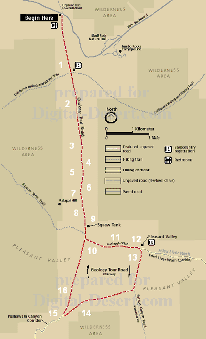 Geology Tour Road: Stop #2 A Raindrop Divides![]() This knoll is the north-south drainage divide for the park. Typically, one would think a divide would occur on the crest of a mountain range. However, in this case water drains either northwest to Quail Springs Wash, or southeast into Pinto Basin through the Fried Liver Wash, depending on which side of the knoll it falls. The Queen Valley actually is shaped like a broad dome if viewed from a distance. PREVIOUS - NEXT
