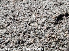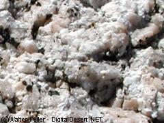 Geology Tour Road: Squaw Tank White Tank MonzograniteThe White Tank monzogranite originally formed 15 to 20 miles below the surface of the earth as magma. This magma cooled slowly, which allowed for large crystals to form from the mineral grains.