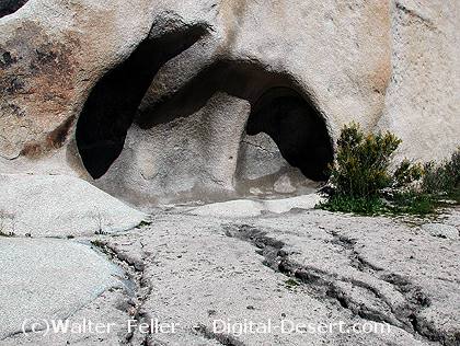 Mojave Ecozone: Geology Tour Road: Squaw Tank Cavernous WeatheringCavernous weathering produces pits and hollows on rock surfaces. Water catches in irregularities and begins a chemical breakdown of the rock into clay. This clay holds more moisture and produces an even larger amount of breakdown in the rock. As the pit becomes larger it can produce shade, cooling the retained water and occasionally freezing, as well as fostering lichen growth. These processes promote both the chemical and mechanical breakdown of the rock.PREVIOUS - NEXT