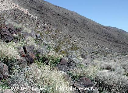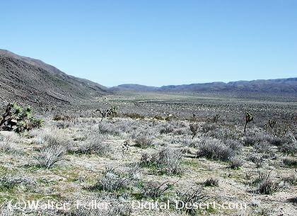 Mojave Ecozone: Geology Tour Road: Stop #10 Pleasant ValleyThe Blue Cut fault is an earthquake fault that runs for about 50 miles through the Little San Bernardino Mountains, under Pleasant Valley, and into the Pinto Basin. It is named after the Blue Grandiorite exposed on the mountains at the southwestern edge of Pleasant Valley, the main branch of the fault.![]() Pleasant Valley - looking east The Hexie Mountains were pushed up from the northern branch of the fault to form the steep, straight southern edge of this range of gneiss. The land to the south, between the two branches, dropped down and subsided to create the depression that became the Pleasant Valley. ![]() Desert varnish Patina The dark rocks at the end of the Hexie range are coated with a patina. Known as "desert varnish," this coating is composed of clay, iron and manganese oxides. Accumulation of this patina happens at an incredibly slow rate over thousands of years. The layers of patina can be read by scientists investigating climatic changes over these thousands of years. PREVIOUS - NEXT
