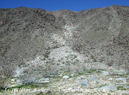 Mojave Ecozone: Geology Tour Road: Stop #11 Debris Flows![]() Occuring at the mouth of this steep canyon in the Hexie Mountains, are irregular mounds of gneiss debris lacking a coating of patina. This lack of patina indicates more recent flows, not yet resulting in a debris fan. During heavy rains, the debris becomes saturated and oozes toward lower ground. As materials from higher up in the canyon wear down, a debris fan may develop, then possibly, over a long period of time an alluvial fan. PREVIOUS - NEXT