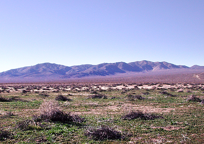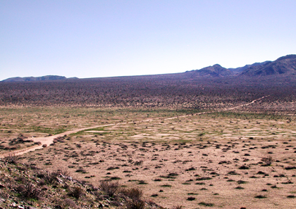 Mojave Ecozone: Geology Tour Road: Stop #13 Pleasant Valley Dry Lake![]() Looking south across the playa The upheaval of the Hexie Mountains with subsidence of the area north of the southern fault line, created a low area in which a periodic lake existed during a wetter climate. Sediments made of clays and sand were carried from nearby slopes and alluvial fans to be deposited at depths of several hundred feet. As time went on, and the lakebed rose, the slope extending from the canyons and alluvial deposits lessened. With this, finer silts and dissolved salts drying began to level the bottom of the valley creating what we see now as a dry lake, or playa. Although salt deposits here are not as obvious as in other desert dry lakes (where extremely few, or, no plants grow), evidence of the salt content can be seen in the presence of salt-tolerant plants species. Interestingly, after heavy rains, many dry lakes become temporary "wet" lakes. ![]() Looking west across the playa PREVIOUS - NEXT