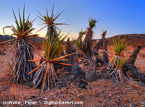 Points of Interest Lucerne Valley & Vicinity Yucca Clone RingsLocated near the Fry Mountains, this fenced Area of Critical Environmental Concern (ACEC) contains nearly yucca clone rings of yucca (yucca schidigera) plants. Each ring started from a single plant possibly as far back as thousands of years ago and is a natural clone of the original. As the rootlets from the existing yucca plant sprouts and grows immediately next to it, the ring is formed over long periods of time.For more information on yucca rings, click here. For more information about the Mojave yucca, click here. |