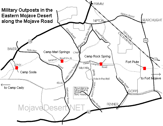 Fort MojaveFort Mojave was originally established April 19, 1959 by Major L.A. Armistead in order to protect travelers from the Mohave Indians at the Colorado River.Fort PiuteEstablished in late 1859 by Captain James H. Carleton, 1st Dragoons, this desert post was located near Piute Springs in the foothills ...Camp Rock SpringsAn official Army post, Camp Rock Spring in the Mojave Desert, on the road from Camp Cady to Fort Mohave, Arizona, located near Kelso, ...Marl SpringsIt may have been the last of the desert redoubts to be established, but Camp Marl Springs' history indicates it was one of the most ...Camp Soda SpringsThis desert camp, variously named for the dry soda lake in its vicinity, was first established south of ... |