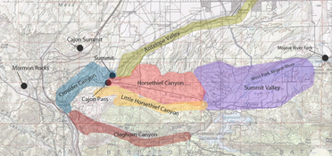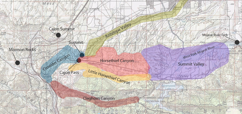 Summit Valley lies in the transition zone between the Mojave Desert and Southern California Mountains and Valleys ecosystems east of the Cajon Pass and in between Hesperia, California, to the north and the San Bernardino National Forest to the south. The west fork of the Mojave River naturally emerges from tributaries and groundwater in the valley, however, the Silverwood Lake reservoir now controls the above ground flow. The Pacific Crest Trail traces the south-eastern portion of the hills along the valley from the Mojave River Forks at Deep Creek to Silverwood. In 1776 Francisco Garces came through this valley as did Jedediah Smith in 1826. Summit Valley is also the location of the historic Las Flores Ranch (Dunlop). State Route 138 is the main transportation corridor in and out of Summit Valley. Las Flores RanchThe Ancestral Mojave RiverMojave River - West ForkSummit Valley - Mojave RiverCajon PassHesperia, CaArrowhead PinnaclesFr. Garces - 1776Pioneer of the Mojave:Judge of the PlainsIndians Subdued After Bold AttacksA Second TollhouseExpedition of Father Nuez |