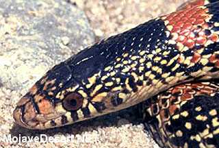 ![]() Long-nosed Snake Photo by Chris Brown ![]() Long-nosed Snake Photo by Chris Brown Additional information: Scientific name: Rhinocheilus lecontei Common name: Western Long-Nosed Snake Size: 18.9-29.5 in (48-75 cm) Distinguishing characters: A slender species; cream ground color; black dorsal saddles with red interspaces; cream or yellow venter; black spotting on a white head; black saddles speckled with white on the sides; very pointed snout; countersunk lower jaw; anterior portion of subcaudal scales undivided in most individuals. Juveniles: Banding more pronounced; speckling on sides faint or absent. Dimorphism: None Similar species: Lampropeltis getula: Have banding completely around body; all subcaudals divided; rounded snouts; lack countersunk lower jaw. Additional notes: A gentle species that vibrates tail when annoyed. Some individuals may hemorrhage from the cloaca and excrete musk when handled. |